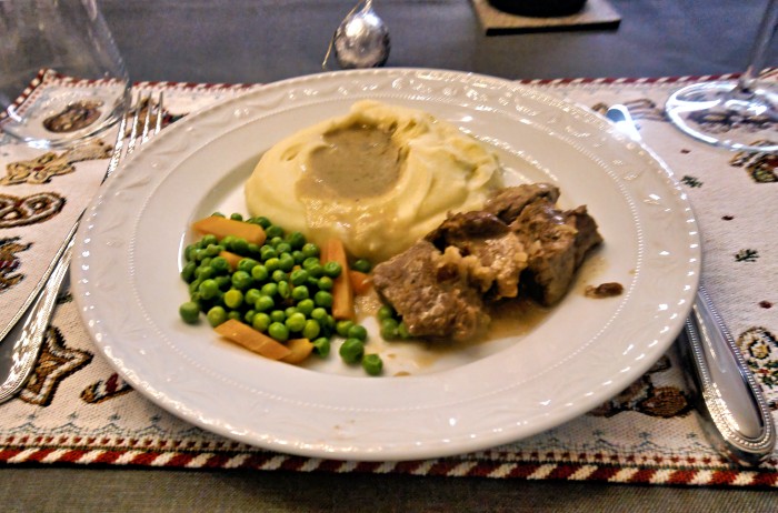 "Kalbsvoressen mit Kartoffelstock, Erbsli und Rüebli"