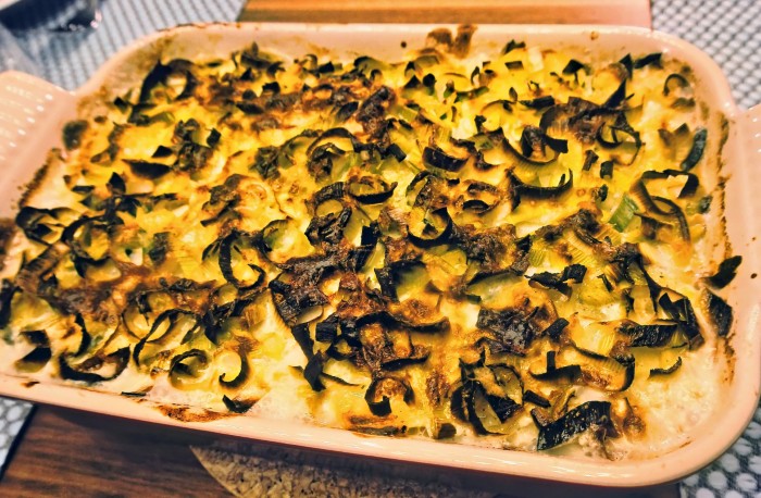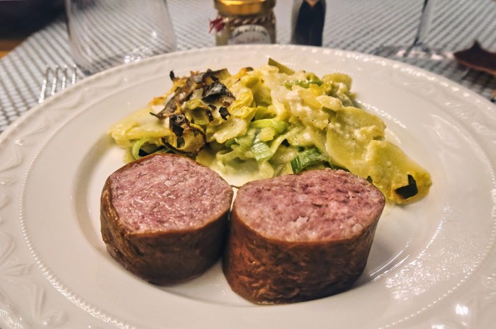 "Kartoffel-Lauch Gratin und Waadtländer Saucissons"